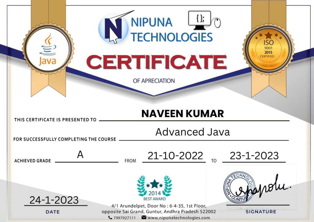 Our training is based on latest cutting-edge infrastructure technology which makes you ready for the industry. Nipuna Technologies will present this certificate to students or employee trainees upon successful completion of the Advanced Java Course, which will encourage and add to trainee’s resume to explore a lot of opportunities beyond position.