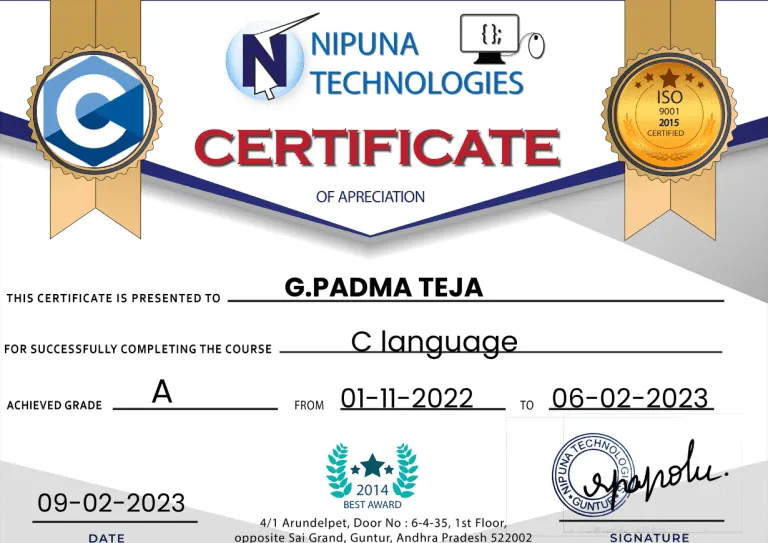 Our training is based on the latest cutting-edge infrastructure and technology, ensuring that every student is fully prepared for the industry. Nipuna Technologies proudly presents this C Programming Course Certification to students and employee trainees upon successful completion of the course. This certification not only validates their programming skills but also enhances their resume, encouraging them to explore a wide range of career opportunities beyond their current position.