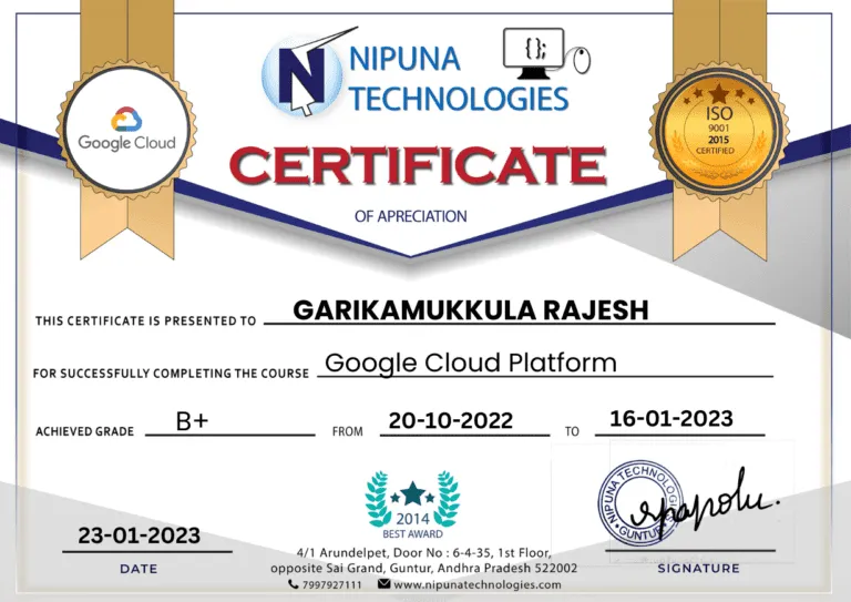 Our Google Cloud Platform (GCP) Course training at Nipuna Technologies, Guntur, is based on the latest cloud infrastructure and modern technology, ensuring you are fully prepared for real-world cloud environments. Upon successful completion of the course, Nipuna Technologies will award an Industry-Recognized GCP Certification.