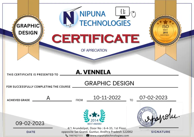 Our Graphics Designing Course training at Nipuna Technologies, Guntur, is designed with the latest industry standards, tools, and technology to help you become a professional graphic designer. Upon successful completion of the course, Nipuna Technologies will award an Industry-Recognized Graphics Designing Certification.