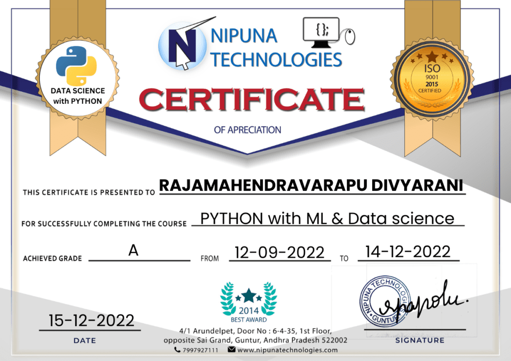Our training is based on the latest cutting-edge infrastructure and technology, ensuring you are fully industry-ready. Nipuna Technologies will present this certificate to students or employee trainees upon successful completion of the Machine Learning with Python Course, which will enhance and strengthen their resumes, helping them explore numerous career opportunities in the fields of Data Science, Artificial Intelligence, and Automation.