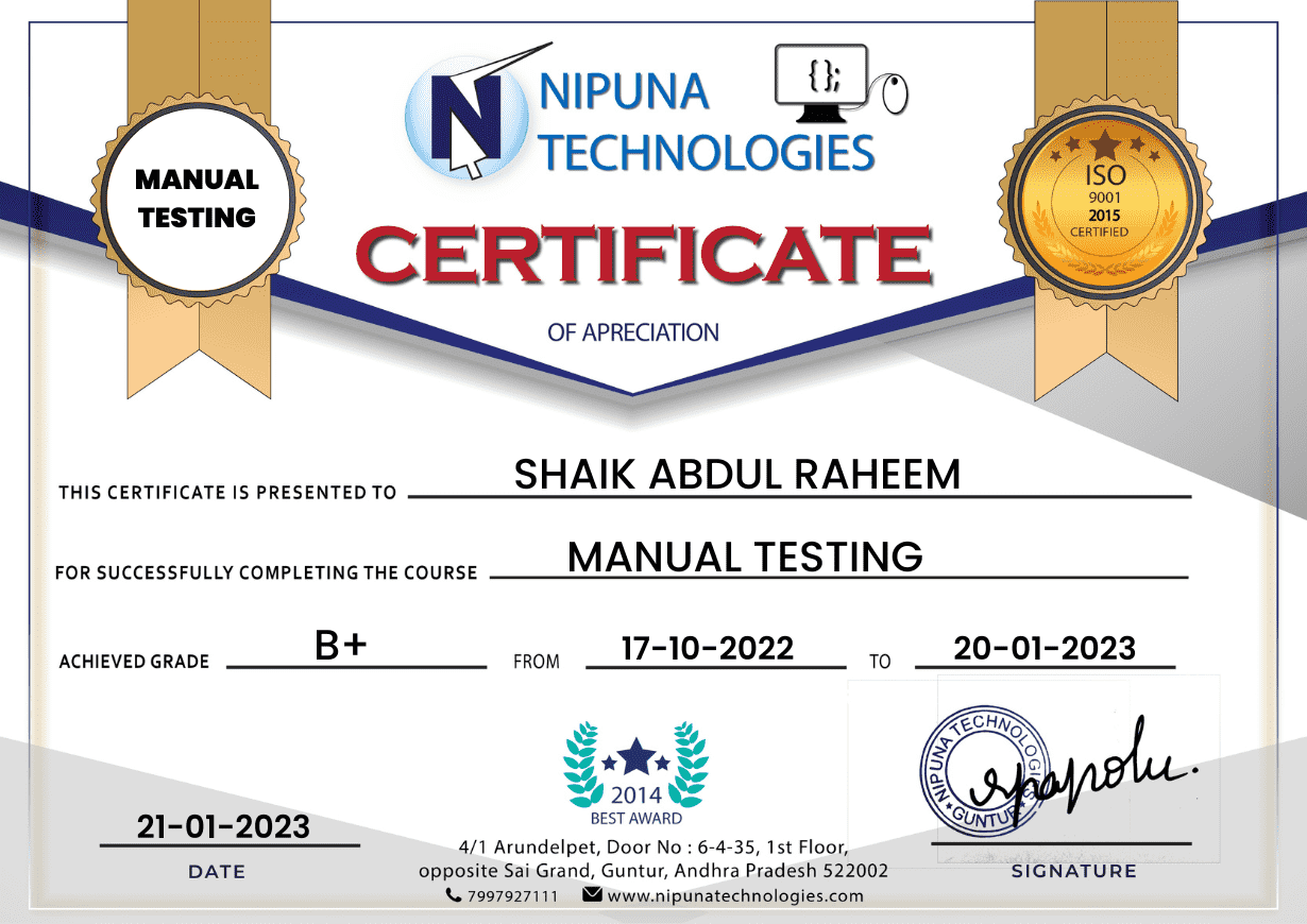 Our training is based on the latest cutting-edge infrastructure and technology, ensuring you are fully prepared for the industry. Nipuna Technologies will present this certificate to students or employee trainees upon successful completion of the Manual Testing Course in Guntur, which will enhance their resumes and open up numerous career opportunities in the field of Software Testing and Quality Assurance.