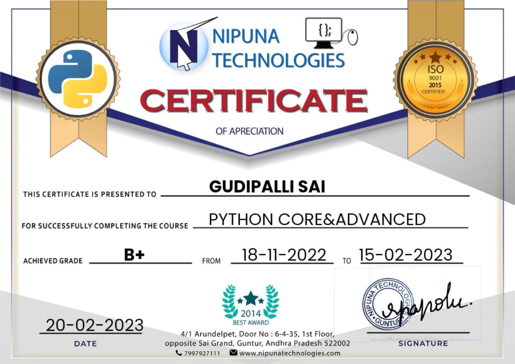Upon successful completion of the course, Nipuna Technologies will award an Industry-Recognized Python Core & Advanced Certification, which enhances your technical profile, validates your coding expertise, and opens up numerous career opportunities in software development, automation, data science, and AI.